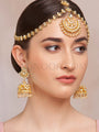 Introducing our majestic Gold Matha Patti with Earrings set, a testament to timeless elegance and meticulous craftsmanship. Crafted in a distinguished dull gold finish, this ensemble is adorned with the regal beauty of Kundan, creating a harmonious blend of traditional opulence and contemporary sophistication.