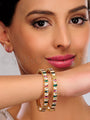 Make a statement with this exquisite Pair of Bangles, celebrating the beauty of traditional design and the harmonious blend of rhodonite, pachi kundan, and green jade. Elevate your ensemble with the regal charm of these bangles, making them a cherished and versatile addition to your jewelry collection.