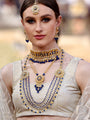 The Rani Haar is an embodiment of royal elegance, featuring a long, flowing design that drapes beautifully around the neck. It is adorned with an array of blue iolite stones, pearls, and Pachi Kundan work, making it a statement piece that adds depth and dimension to your bridal look.