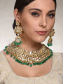 Ideal for the discerning bride who appreciates heritage and modern elegance, this Bridal Set reflects a commitment to excellence. The distinguished dull gold finish enhances the brilliance of Pachi Kundan and the vibrancy of green jade stones, ensuring a captivating presence on the most special day.