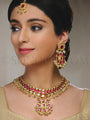 Ideal for the discerning bride who seeks a perfect synthesis of heritage and modern allure, this Bridal Set reflects meticulous craftsmanship and a commitment to excellence. The distinguished dull gold finish enhances the brilliance of Kundan stones and the vibrant elegance of red jade, ensuring a captivating presence on the most special day.