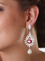 Adorned with the brilliance of cubic zircons and the fiery red charm of ruby CZee stones, these long earrings are a celebration of opulence and sophistication. The cubic zircons lend a captivating sparkle, while the ruby CZee stones add a rich burst of color, creating a mesmerizing visual symphony. The pièce de résistance is the delicate hanging pearl droplet that adds a touch of classic grace, completing the ensemble with timeless elegance.