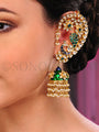 Adding a burst of vibrant color and cultural richness, these Jhumki earrings showcase the intricate artistry of Meena Kari detailing. The fusion of kundan stones and Meena Kari creates a harmonious and visually captivating accessory that seamlessly blends classic charm with artistic flair.