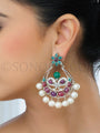 Adorned with a brilliant array of cubic zircons, fiery rubies, vibrant emeralds, and delicate hanging pearl droplets, these earrings are a symphony of color and brilliance. The cubic zircons add a captivating sparkle, while the rubies and emeralds infuse a rich palette of red and green, creating a harmonious blend of hues. The pièce de résistance is the graceful hanging pearl droplets, adding a touch of classic charm that sways with every movement.