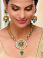 Elevate your elegance with our Dull Gold Pendant Set with Earrings, a fusion of opulence and natural beauty. Expertly crafted with a rich dull gold finish, this set features a captivating ensemble of ruby, onyx, and jade stones.