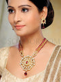 The dull gold finish adds a touch of vintage-inspired charm, making this Pendant Set with Earrings a versatile accessory suitable for various occasions. Elevate your style with the classic combination of Pachi Kundan and rhodonite, creating a look that exudes sophistication and enduring beauty. Make a statement with this exquisite set, capturing the essence of timeless glamour and the natural allure of precious gemstones.