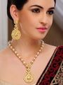 The pendant takes center stage with its intricately designed centerpiece, where yellow Pachi Kundan stones shimmer with a captivating brilliance. Complementing this opulent pendant, the earrings mirror the same luxurious detailing, ensuring a perfectly coordinated ensemble.