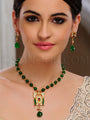 The pendant takes center stage with its intricately designed centerpiece, where Pachi Kundan stones sparkle alongside the regal green of jade and the refined pink of rhodonite. Complementing this opulent pendant, the earrings mirror the same luxurious detailing, ensuring a perfectly coordinated ensemble.