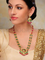 The pendant commands attention with its intricately designed centerpiece, where the radiant kundan stones harmonize with the captivating green hues of jade. Complementing this opulent pendant, the earrings mirror the same luxurious detailing, ensuring a perfectly coordinated ensemble.