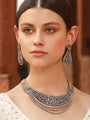 The choker-style necklace, featuring a unique Victorian Silver-Gold Dual Finish, becomes a canvas for the detailed artistry of Cubic Zircons. The dual-tone finish adds a touch of opulence and uniqueness, creating a captivating play of light that exudes an air of refinement and classic beauty.