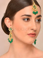 The Maang Tika graces the forehead with sophistication, while the matching Earrings frame the face with regal beauty. The Kundan detailing adds a touch of timeless charm, complemented by the intricate Meena Kari work and the graceful movement of hanging jade droplets.