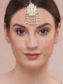 The Maang Tika gracefully rests on the forehead, adding a touch of regality to your ensemble. The intricate Kundan detailing showcases timeless charm, complemented by the refreshing vibrancy of jade stones.