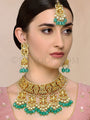 The chain-style necklace, featuring a resplendent dull gold finish, serves as a canvas for the detailed artistry of Kundan. The delicate arrangement of pearls adds a touch of grace, and the Matha Patti further complements the set with its intricate design, creating a captivating look that exudes refinement and cultural elegance.
