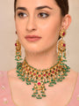The choker-style necklace, featuring a resplendent dull gold finish, becomes a canvas for the detailed artistry of Kundan. Intertwined with the soothing charm of Jade and the natural allure of Agate stones, the ensemble exudes an air of sophistication and opulence, capturing attention with its harmonious blend of classic charm and modern grace.