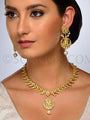 Whether you're attending a special occasion or seeking to elevate your everyday style, this necklace set with earrings is designed to make a statement. The combination of dull gold, Kundan, green jade stones, and iolite stones forms a versatile and enchanting accessory that effortlessly enhances your unique style.