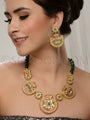 Whether gracing a special occasion or enhancing your everyday style, this Necklace Set with Earrings is designed to captivate. The combination of gold finish, Kundan, and red-green jade stones creates a versatile and enchanting accessory that effortlessly enhances your unique style.