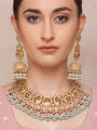 The choker-style necklace, featuring a resplendent dull gold finish, becomes a canvas for the detailed artistry of Kundan. The lustrous pearls and the graceful green Jade droplets enhance the overall opulence, creating a captivating look that exudes an air of sophistication and tradition.