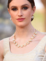 The warm and nostalgic dull gold finish of the necklace becomes a canvas for the delicate beauty of Pearls, harmoniously complemented by the dazzling sparkle of Cubic Zircons. The ensemble creates a captivating play of elements that exudes an air of sophistication and timeless beauty.