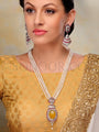 The pendant takes center stage with an intricately designed centerpiece, where cubic zircons sparkle alongside the mesmerizing allure of cameleon stones. Complementing this opulent pendant, the earrings mirror the same exquisite detailing. The stringing of fresh water pearls adds a touch of classic refinement, creating a seamless flow that enhances the overall aesthetic.