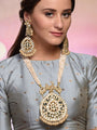 The pendant, adorned with meena kari and kundan stones, takes center stage, exuding timeless charm and sophistication. Adding a touch of opulence, delicate pearl droplets gracefully hang from the pendant, creating a dynamic interplay of classic and contemporary aesthetics. The accompanying earrings mirror the same level of artistry, completing the set with grace and style.