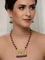 The pendant becomes a focal point of refined elegance, boasting meticulous detailing and a captivating interplay of kundan and ruby embellishments. The matching earrings mirror this craftsmanship, completing the set with grace and style.