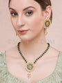 Indulge in opulence with our Pendant Set and Earrings, a stunning ensemble featuring a distinguished dull gold finish adorned with the regal brilliance of kundan, complemented by the vibrant hues of red and green jade stones. Meticulously crafted, this set marries traditional elegance with contemporary flair.