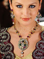 Presenting our handcrafted Pendant Set with Earrings, an exquisite fusion of heritage and modern elegance in a resplendent dull gold finish. This captivating jewelry set is adorned with the timeless allure of cubic zircons, Kundan, pearls, rubies, and jade stones, creating a harmonious symphony of opulence and sophistication.