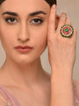 The gold finish lends a touch of classic glamour, while the intricately set Kundan and jade stones contribute to the ring's opulent and colorful design. Whether worn as a standalone piece or paired with other accessories, this finger ring is sure to make a statement and capture attention.