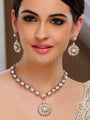 The carefully crafted necklace showcases a graceful arrangement of citrine stones and pearls, creating a captivating focal point. The matching earrings mirror the allure of the necklace, completing the ensemble with grace and poise. The Silver Rhodium finish not only enhances the overall aesthetics but also ensures durability and longevity, making this set a versatile choice for various occasions.