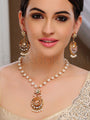 The pendant takes center stage with its delicately designed centerpiece, where Meena Kari, pearls, and Pachi Kundan stones harmonize to create a visually captivating masterpiece. Complementing this opulent pendant, the earrings mirror the same luxurious detailing, ensuring a perfectly coordinated ensemble.