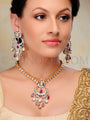 The pendant commands attention with its intricately designed centerpiece, where cubic zircons sparkle alongside the intricate detailing of kundan and the deep red hues of agate stones. Complementing this opulent pendant, the earrings mirror the same luxurious detailing, ensuring a perfectly coordinated ensemble.